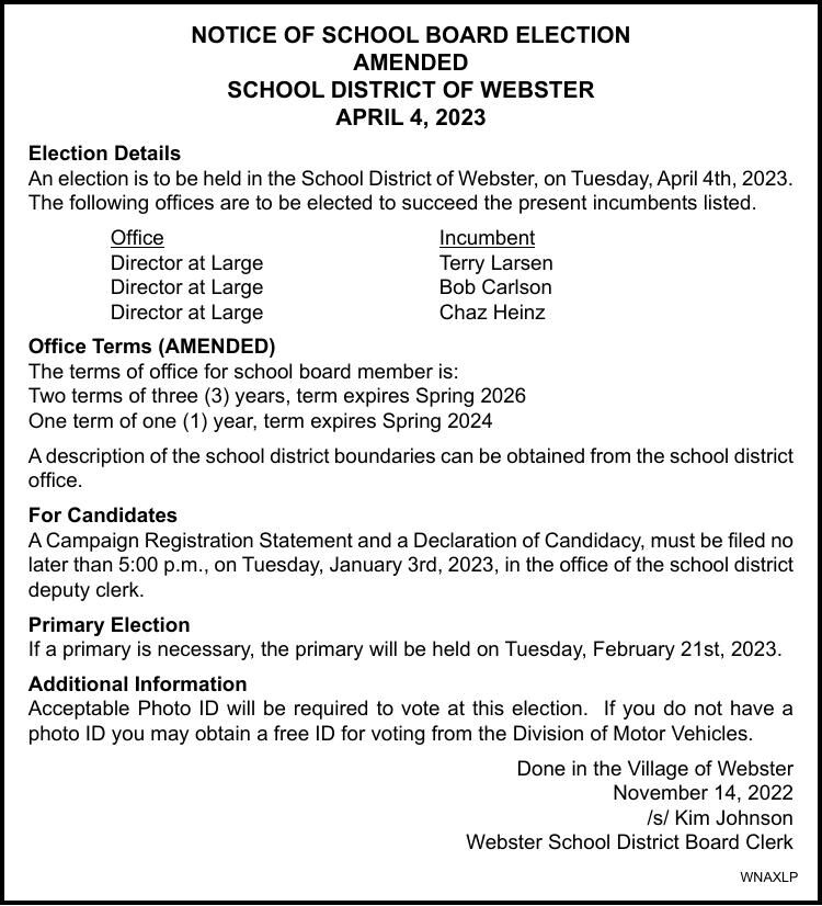 Source : www.etsy.comNOTICE OF SCHOOL BOARD ELECTION AMENDED SCHOOL DISTRICT OF WEBSTER